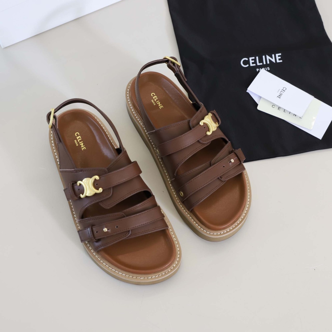 – 카프스킨 100% – 안감: 카프스킨 100% – 상단 스트랩에 길이 조절 가능한 트리옹프 메탈 피스 및 슈즈 하단 스트랩에 칼라 버튼 – 길이 조절 가능한 버클 – 가죽 커버 인솔 – 폼 인서트와 가죽 웰트 러버 아웃솔