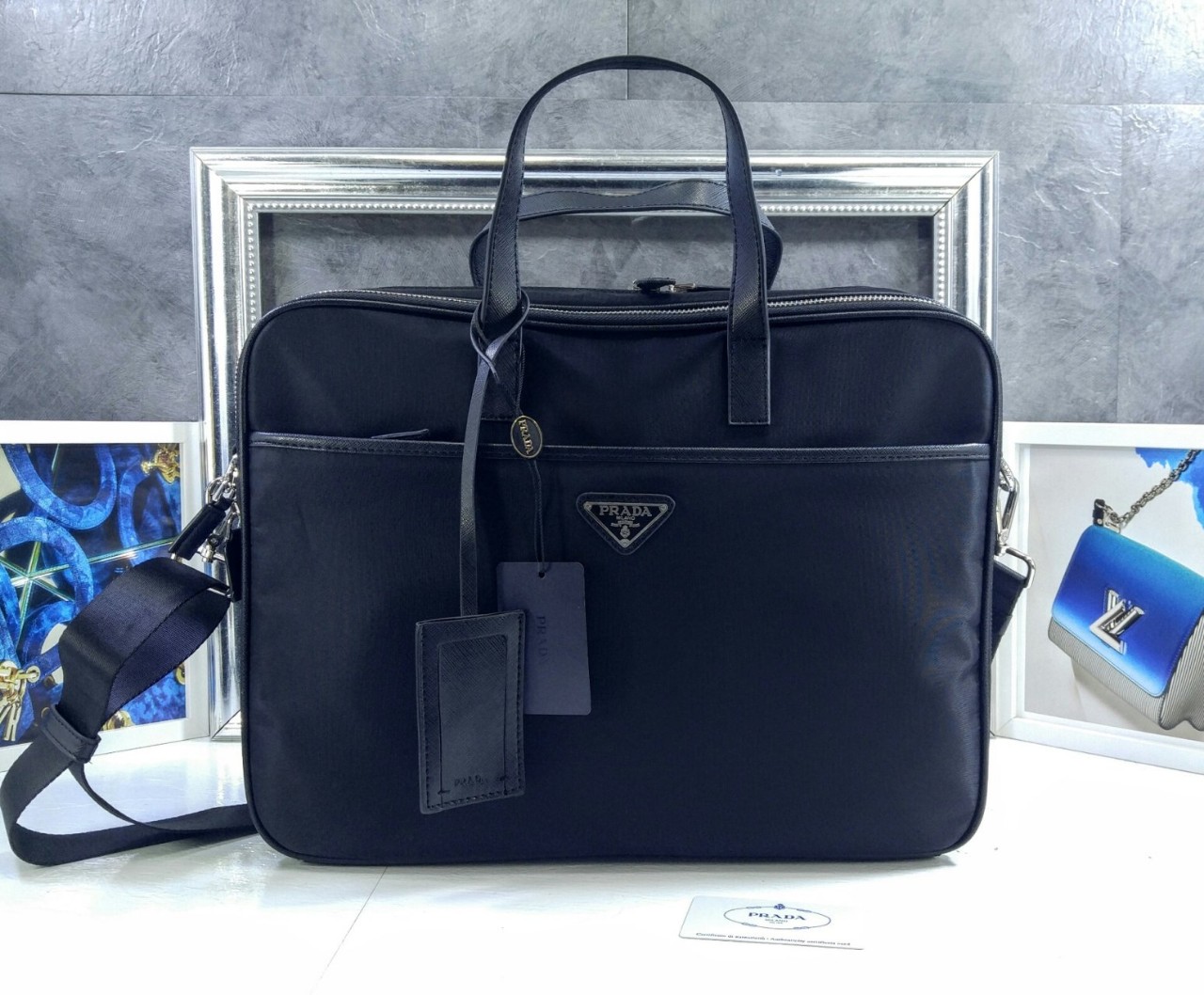 페브릭 / 가죽 2개의 컴파트먼트 플랫 가죽 핸들 탈부착이 가능한 조절 가능한 우븐 나일론 테이프 숄더 스트랩 앞면의 에나멜 메탈 트라이앵글 로고 지퍼 잠금 탈부착 가능한 가죽 이름표 외부 지퍼 포켓 1개 지퍼 포켓과 패치 포켓, 작은 패치 포켓이 있는 내부 로고 프린트 나일론 안감